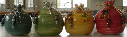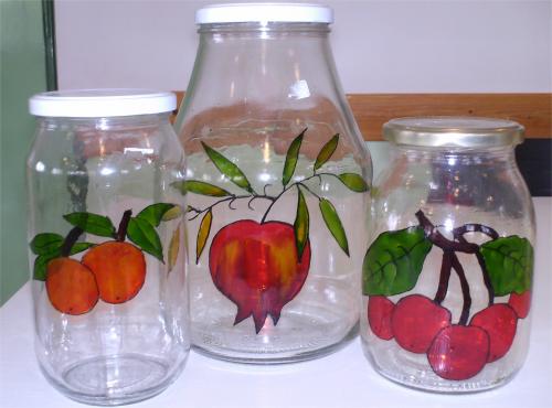 Διακοσμητικά ρόδια και γυάλινα βάζα για την κουζίνα. Δεξιά, δίσκος και διακοσμητικό κουτί με ζωγραφικές αναπαραστάσεις.