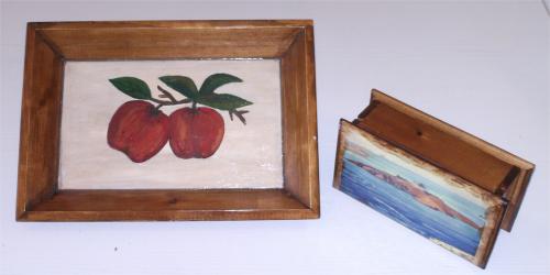 Διακοσμητικά ρόδια και γυάλινα βάζα για την κουζίνα. Δεξιά, δίσκος και διακοσμητικό κουτί με ζωγραφικές αναπαραστάσεις.